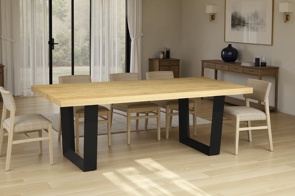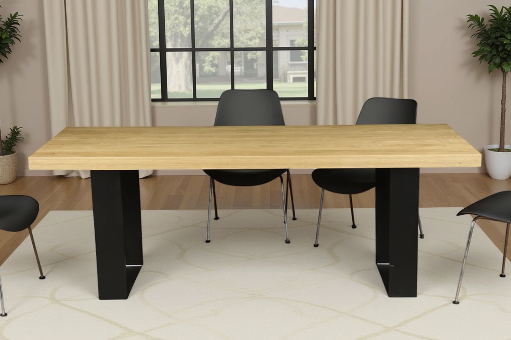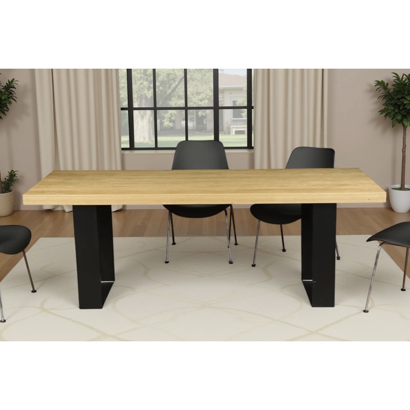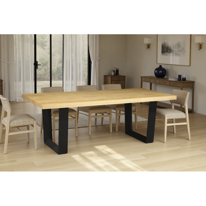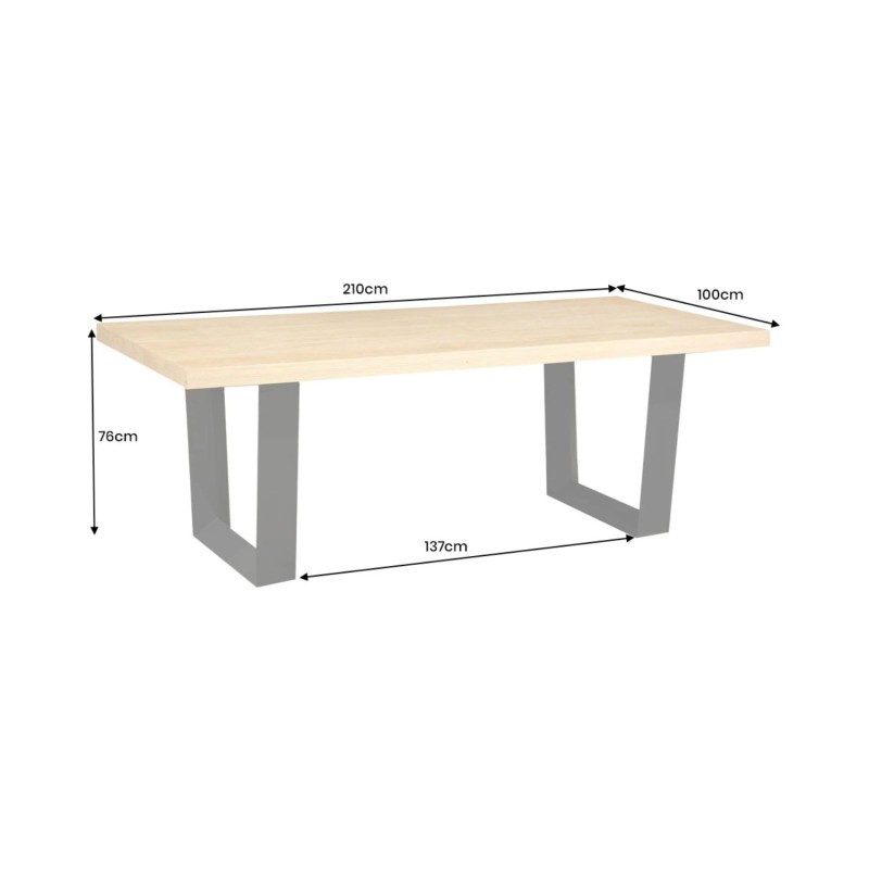 Cette table se distingue par son plateau épais de 60 mm et ses pieds en métal de 5 × 10 cm, assurant stabilité et durabilité au quotidien. La distance de 137 cm entre les pieds permet une assise confortable pour plusieurs convives. Grâce à ses finitions soignées et son aspect bois naturel, elle s’adapte aisément aux salles à manger modernes ou scandinaves.