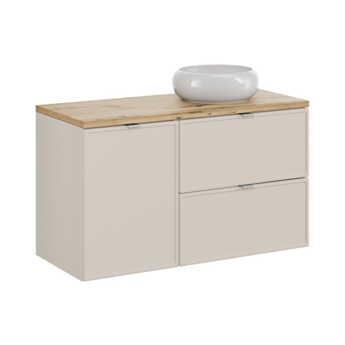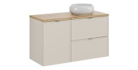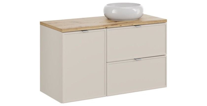 Voeg een natuurlijke en hedendaagse touch toe aan uw badkamer met deze BRAZZA set 100 cm. Het combineert een onderkast met laden en een module met ingebouwde wasmand in mat kasjmier kleur, een houtlook wastafelblad en een witte ronde opzetwastafel voor een harmonieuze en moderne uitstraling.