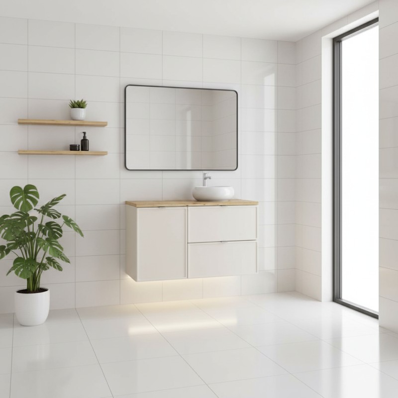 De hoofdkast en de wasmand optimaliseren de ruimte terwijl uw badkamer perfect georganiseerd blijft. De schuifladen bieden praktische en vlotte opbergmogelijkheden voor dagelijks gebruik, terwijl het houtlook wastafelblad warmte en visueel contrast toevoegt. De witte ronde keramische wastafel verzacht het geheel met haar gebogen en heldere lijnen. Deze configuratie is ideaal voor het creëren van een functionele, esthetische ruimte die geschikt is voor gezinsgebruik.