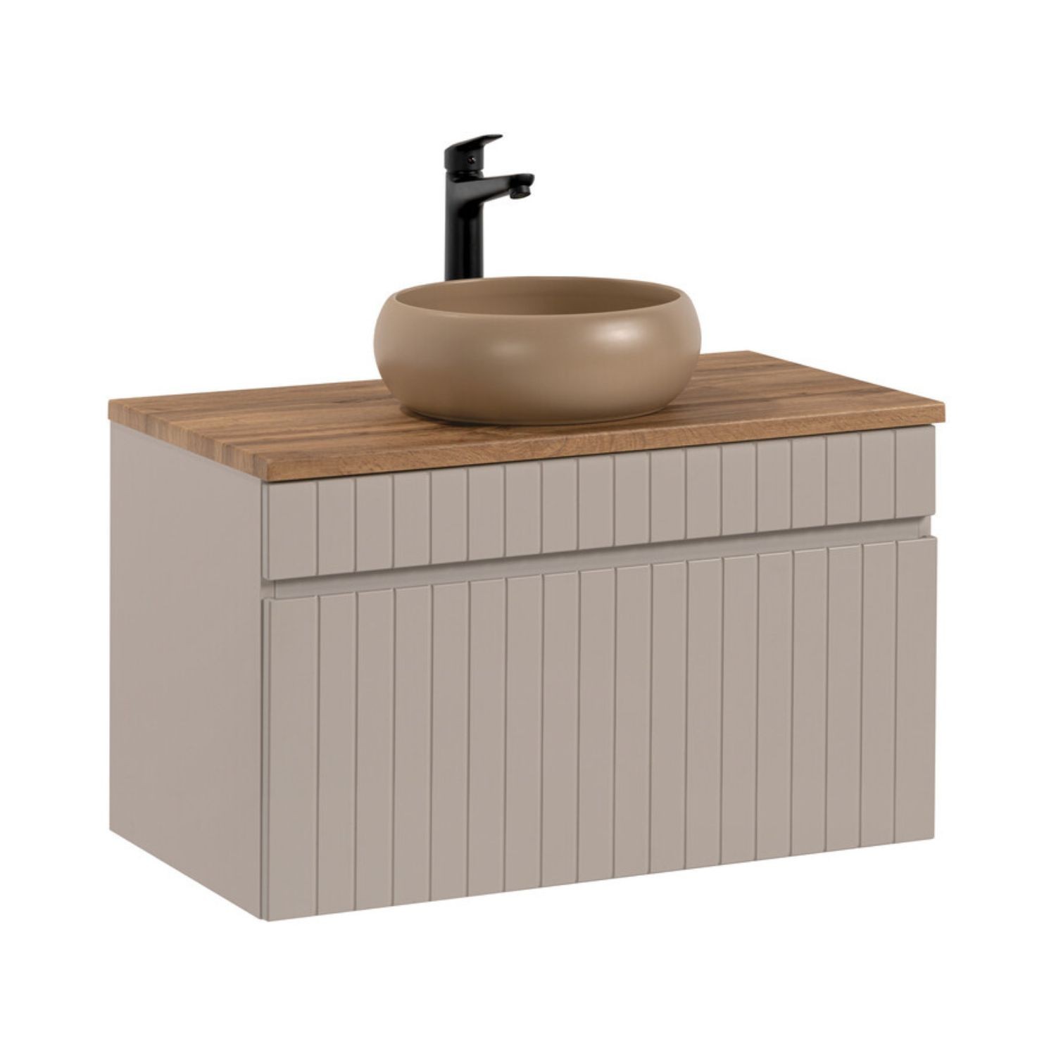 Het donker houten wasbakblad creëert een warm contrast met de matte structuur en bevat een ronde opbouwwaskom van keramiek, die een decoratieve en moderne touch aan de set geeft. Het meubel onder de wasbak met verticaal gegroefde panelen voegt hedendaagse elegantie toe aan deze set.