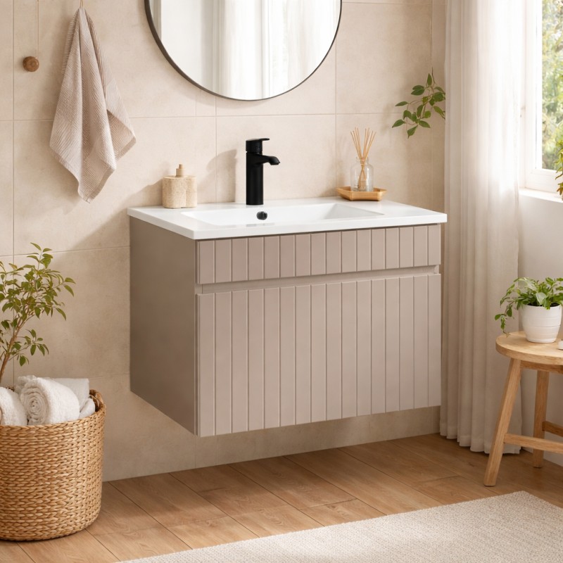 Het verticaal gegroefde onderbouwmeubel biedt een elegante en hedendaagse reliëf. Het is gekoppeld aan een witte keramische inbouwwastafel, perfect geïntegreerd voor een strakke en onderhoudsvriendelijke afwerking.