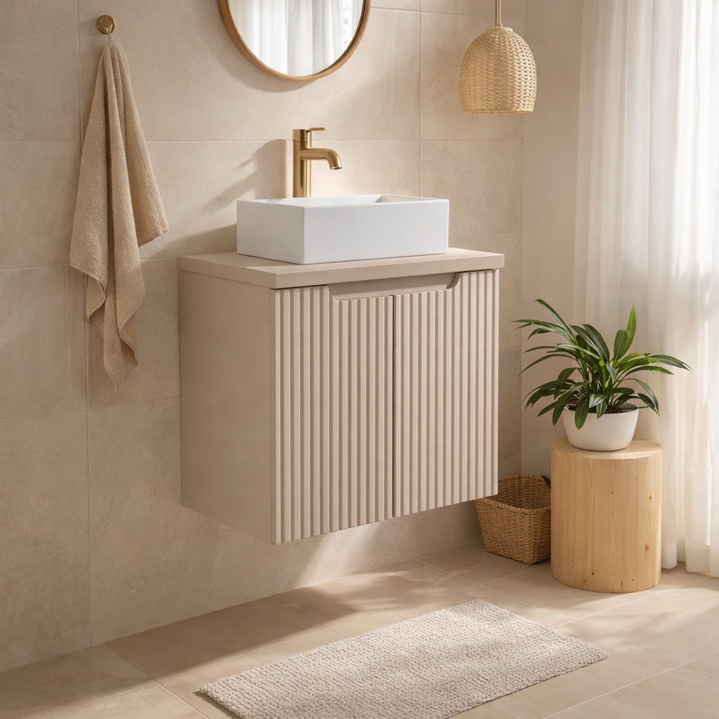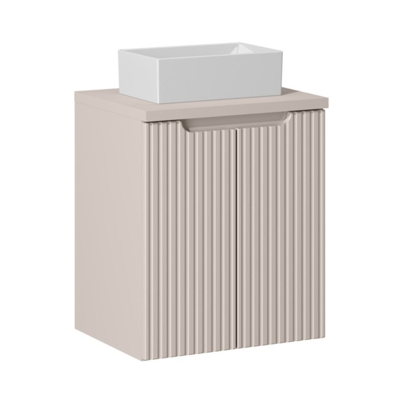 Le meuble sous vasque suspendu en coloris cachemire mat se distingue par ses façades rainurées verticalement, apportant une touche graphique élégante et contemporaine à votre salle de bain.