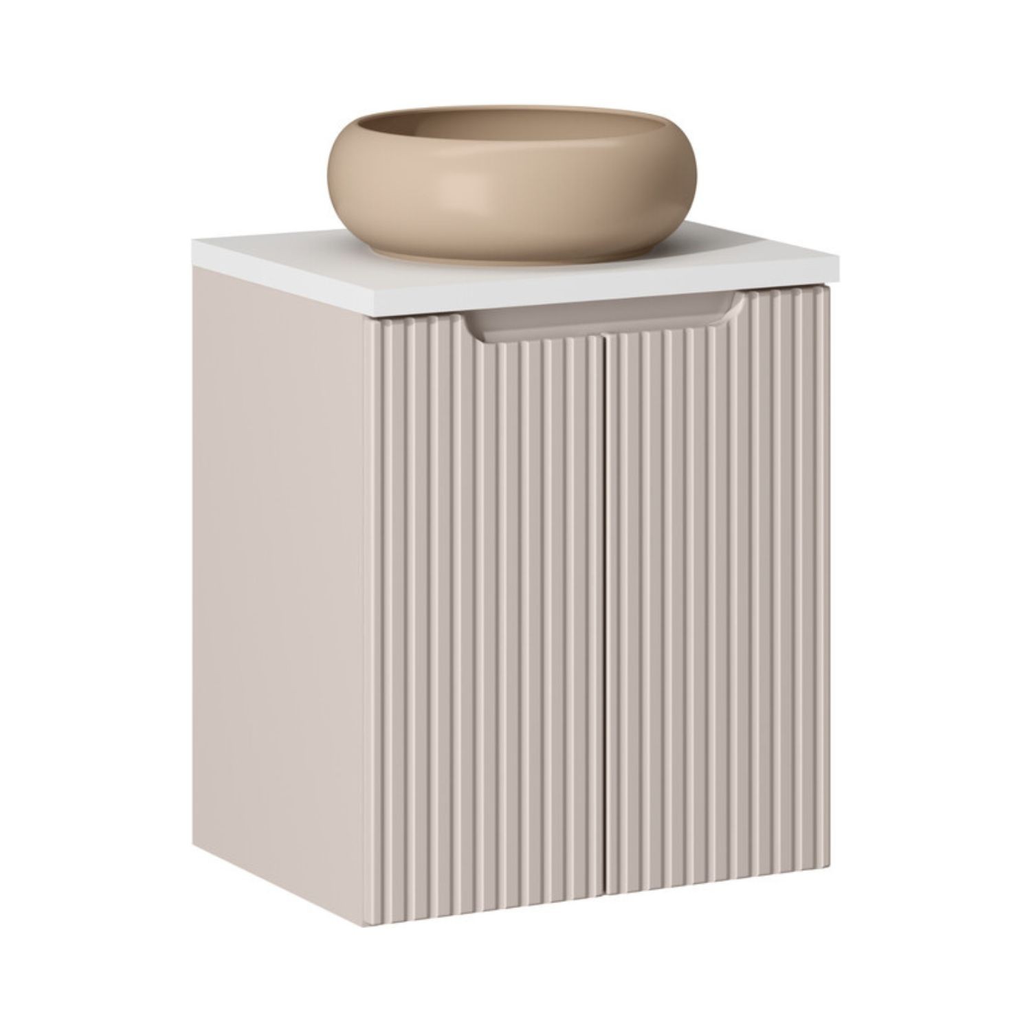 Le meuble sous vasque suspendu en coloris cachemire se distingue par ses façades rainurées verticalement, apportant relief et élégance à votre salle de bain. Il est associé à un plan pour vasque blanc mat, créant un contraste harmonieux et lumineux.