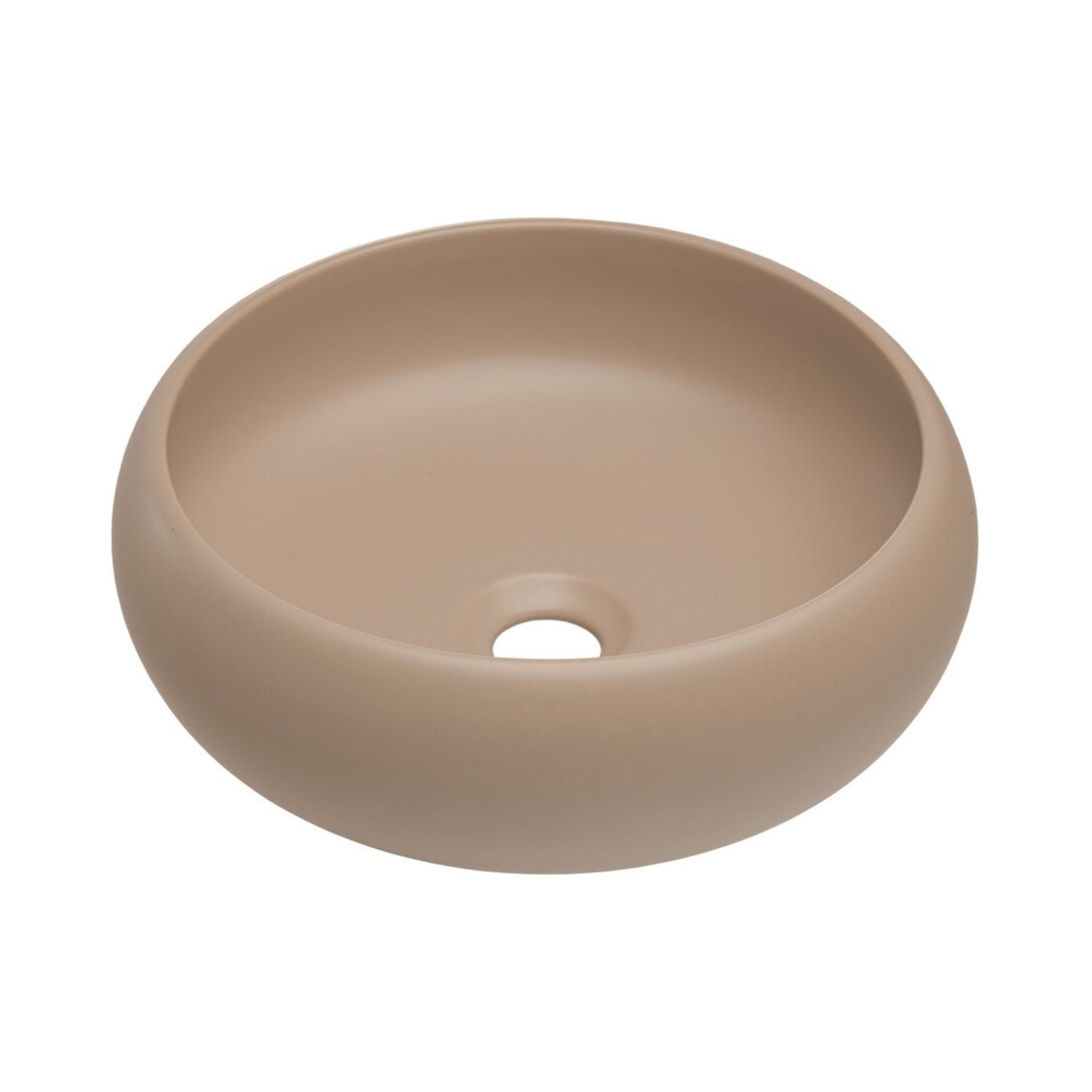 L’ensemble est complété par une vasque à poser ronde en céramique finition cappuccino, idéale pour apporter une touche originale et chaleureuse à votre espace.
