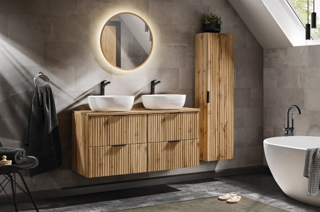 Le NOXERA 120 cm séduit par son look chêne wotan à l’aspect bois authentique, idéal pour créer une salle de bain élégante et accueillante. Le miroir LED intégré apporte une luminosité douce et contemporaine.