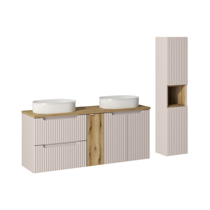 Transformez votre salle de bain avec l’ensemble VANO 170 cm, une composition complète qui allie esthétisme et praticité. Cet ensemble associe des meubles sous vasque suspendus coloris cachemire aux façades rainurées verticalement, un meuble central aspect chêne clair, ainsi qu’un plan pour vasque et deux vasques à poser rainurées blanches au design travaillé.