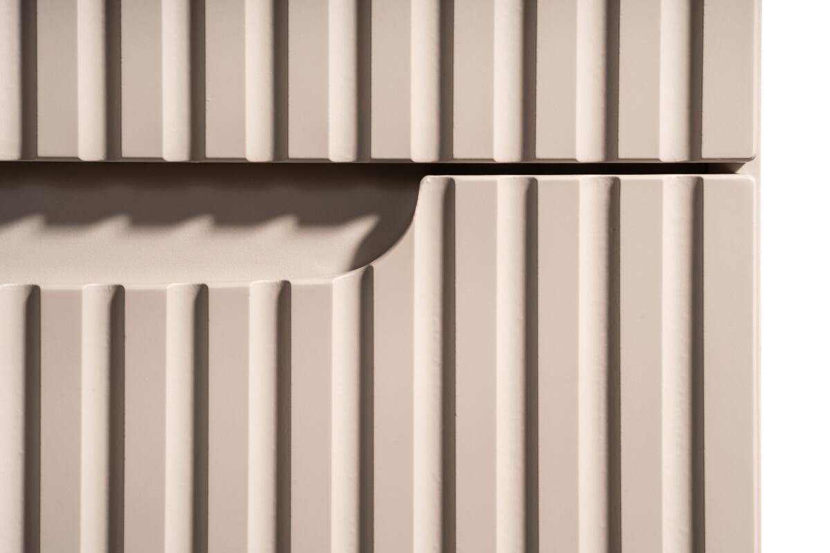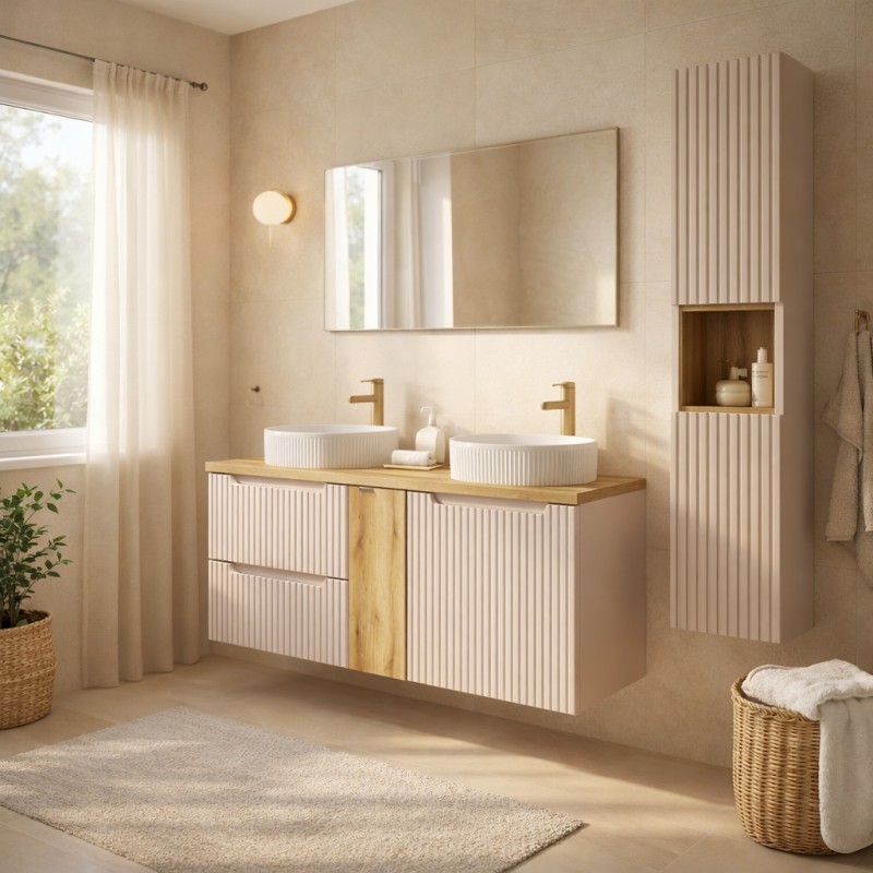 L’association du cachemire et du chêne clair crée une ambiance naturelle et chaleureuse, idéale pour une salle de bain moderne et apaisante. Les finitions rainurées, présentes sur les meubles et les vasques, apportent du relief et renforcent le caractère unique de l’ensemble.