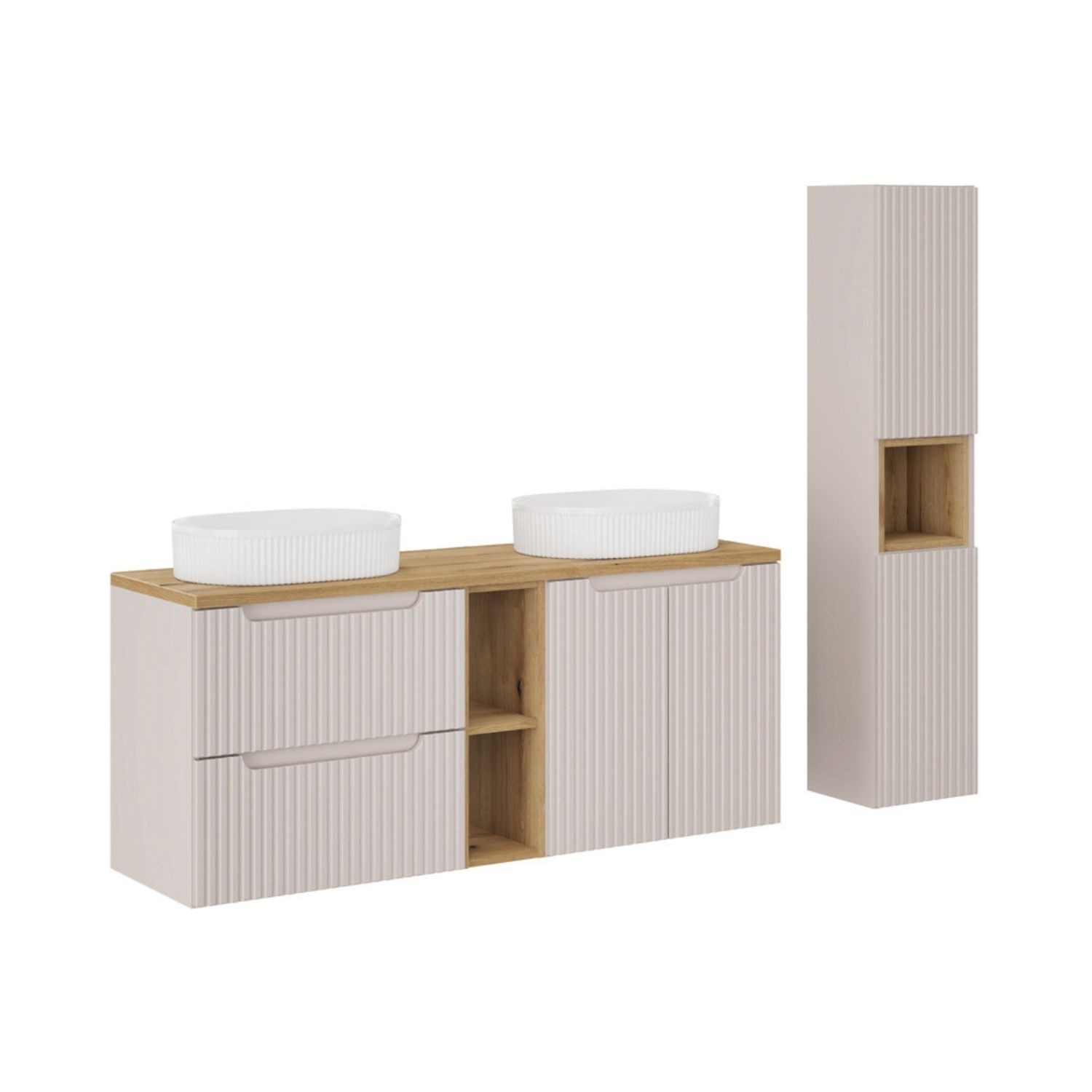 L’ensemble de salle de bain VANO 170 cm est une solution complète et élégante pour aménager une salle de bain spacieuse. Il se compose de meubles sous vasque suspendus cachemire avec façades rainurées verticalement, d’un plan pour vasque aspect chêne clair, de deux vasques à poser, d’un meuble central avec niches visibles, d’une colonne et d’un cube de rangement.
