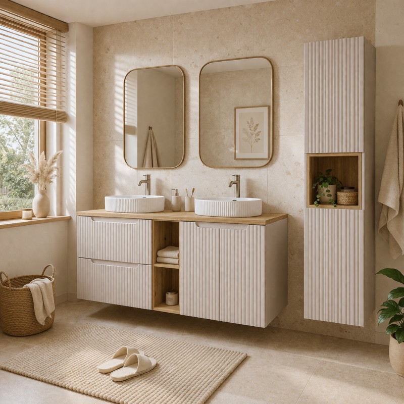 L’association du coloris cachemire et du chêne clair apporte une ambiance chaleureuse et contemporaine, idéale pour une salle de bain moderne et accueillante.
