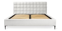 De capitonne hoofdeinde van 112 cm hoog, gestructureerd in royale vierkanten, verfraait uw slaapruimte met een chique grafische esthetiek. Dankzij het inbegrepen houten lattenbodem en de robuuste structuur van massief hout en premium spaanplaat, biedt het MILLIO bed een superieure rustervaring, die design, comfort en duurzaamheid combineert. De 15 cm hoge zwarte metalen poten voegen een moderne touch toe terwijl ze perfecte stabiliteit garanderen.