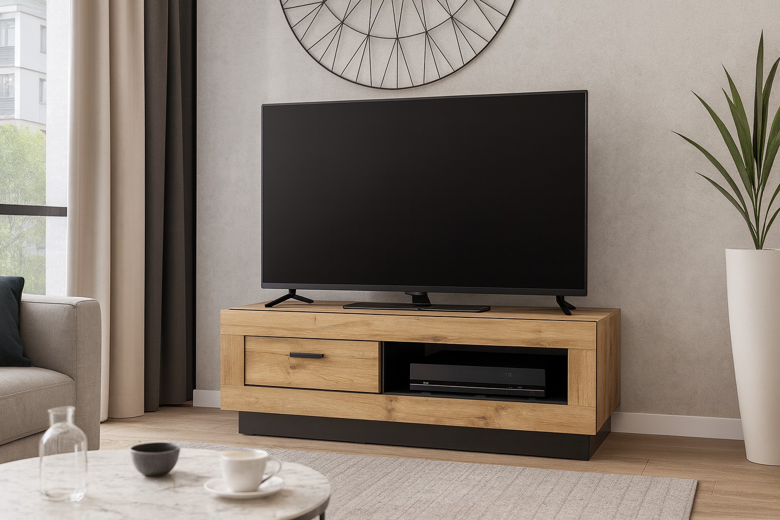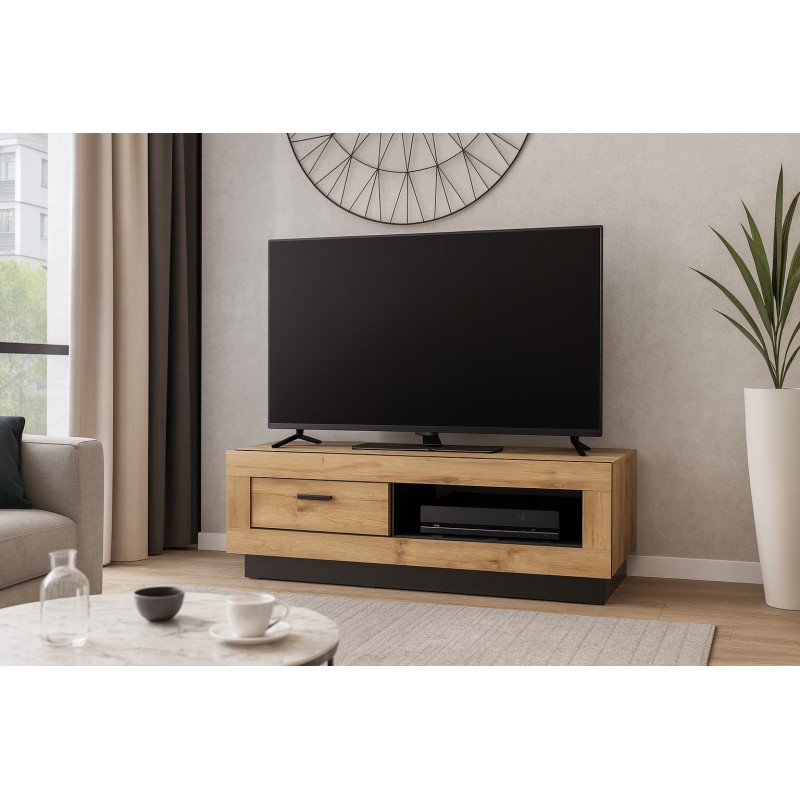 TV-meubel MALAGA - Kleur Wotan eiken en zwartHet TV-meubel MALAGA combineert de charme van Wotan eiken met zwarte accenten voor een moderne industriële look. Met afmetingen van 120 x 45 x 48 cm is het perfect om uw audiovisuele apparatuur te organiseren terwijl het een elegante touch aan uw woonkamer toevoegt. De robuuste constructie en het verfijnde ontwerp maken het een ideale keuze voor een hedendaags interieur.Productkenmerken:Type product: TV-meubelAfmetingen: 120 cm (breedte) x 45 cm (diepte) x 48 cm (hoogte)Kleur: Wotan eiken en zwartStijl: industrieelMaterialen:Blad: Wotan eikenPoten: zwart metaalGewicht: 35 kgComponenten: 1 pakketVoordelen van het TV-meubel MALAGA:Industrieel ontwerp: De mix van Wotan eiken en zwart creëert een moderne en elegante look.Stevige constructie: Gemaakt met kwaliteitsmaterialen voor verhoogde duurzaamheid.Compact en functioneel: Ideale afmetingen voor kleine ruimtes terwijl het voldoende opbergruimte biedt.Onderhoudsgemak: Het Wotan eiken oppervlak is gemakkelijk schoon te maken en te onderhouden.Waarom kiezen voor ons TV-meubel MALAGA?Moderne esthetiek: Ontworpen om perfect te passen in een interieur met een industriële stijl.Praktisch: Biedt functionele opbergruimte voor uw audiovisuele apparatuur.Duurzaamheid: Robuuste materialen zorgen voor een lange levensduur.