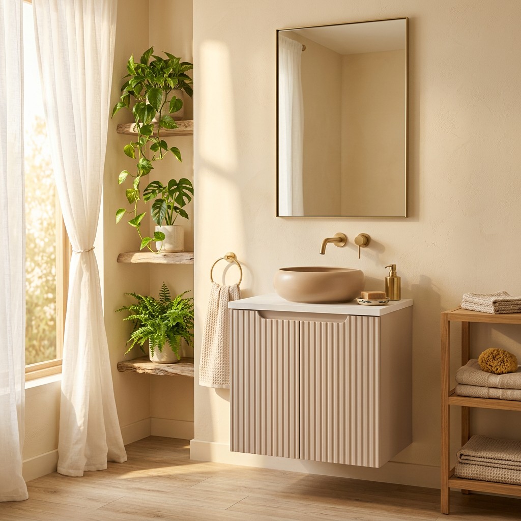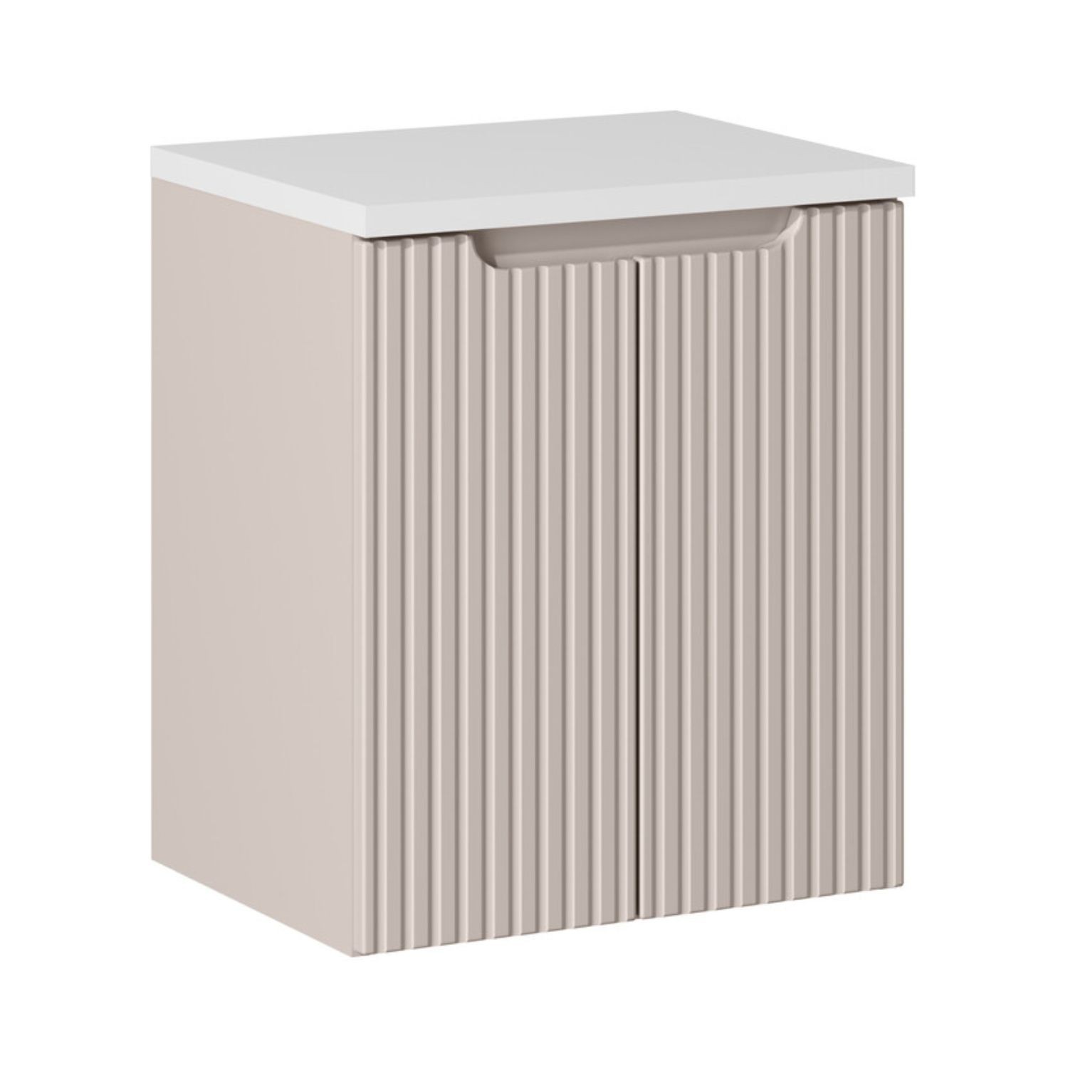 Le meuble sous vasque suspendu en coloris cachemire se distingue par ses façades rainurées verticalement, apportant relief et caractère à votre salle de bain. Son style épuré s’intègre parfaitement dans tous les univers modernes.