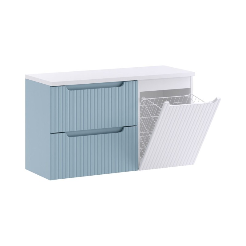Deze functionele set bestaat uit een badkamermeubel met laden in denimblauw en een geïntegreerde wasmand onder de wastafel in wit, ideaal om uw ruimte te optimaliseren terwijl het de dagelijkse organisatie vergemakkelijkt.