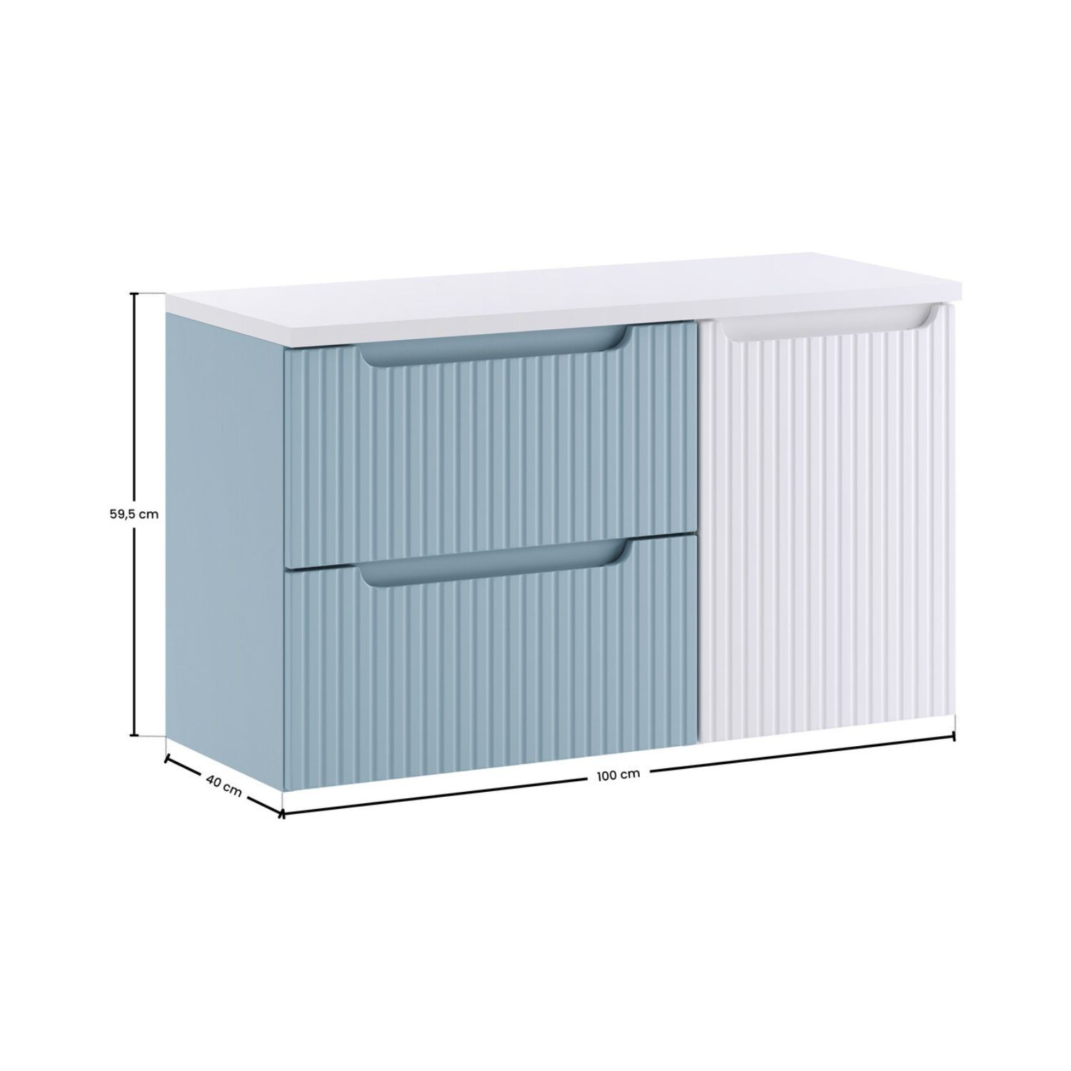 Geef uw interieur een moderne en heldere uitstraling met dit zwevend badkamermeubel VANO 100 cm, dat stijlvol de kleuren denimblauw en wit combineert voor een hedendaagse en strakke uitstraling.