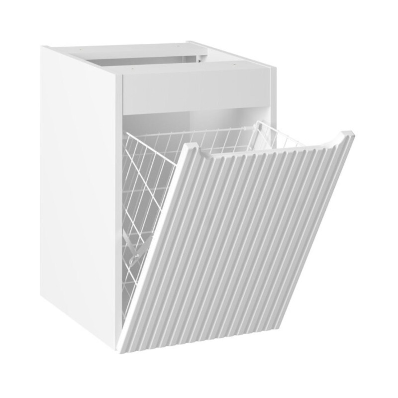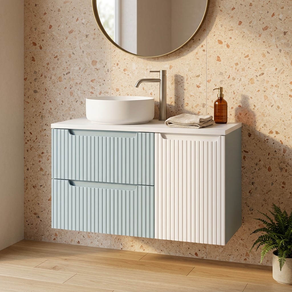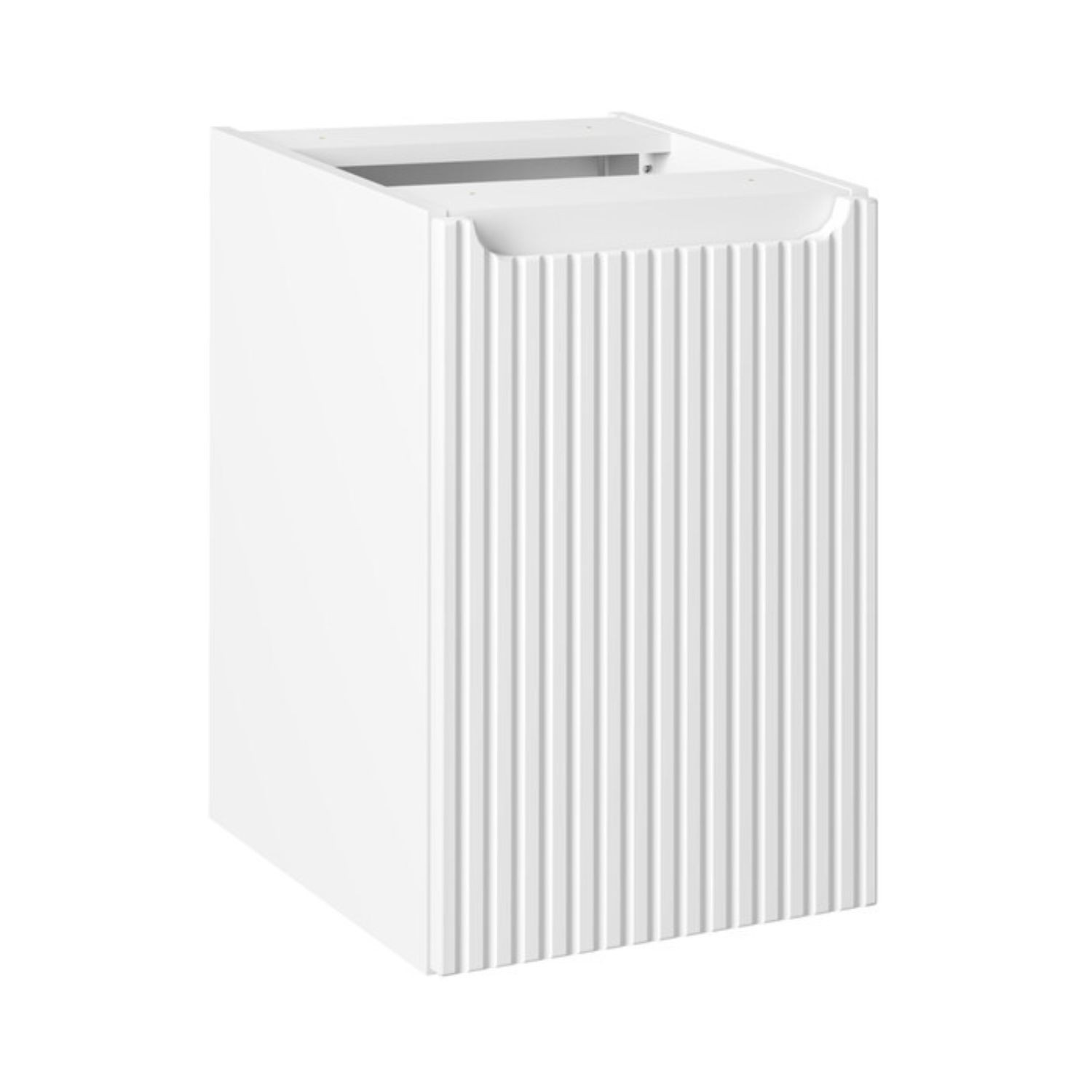 De verticaal gegroefde fronten voegen diepte toe en versterken de designstijl van het meubel, voor een trendy en verfijnde badkamer.