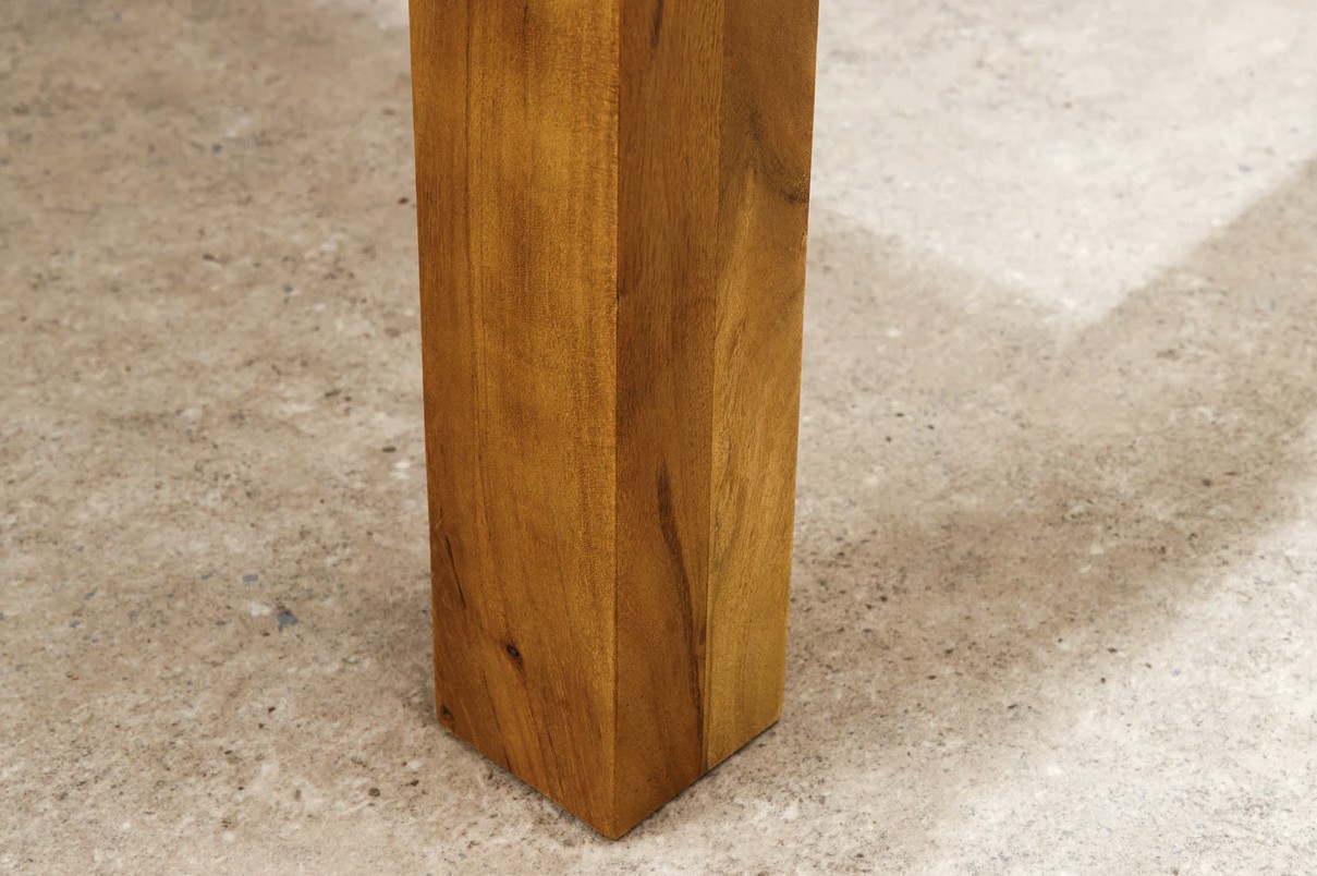 La table est conçue en bois recyclé verni avec une finition miel naturel qui met en valeur les veines du bois. Associée à une structure en métal robuste, elle allie authenticité et modernité pour s’intégrer parfaitement dans une décoration rustique ou industrielle.