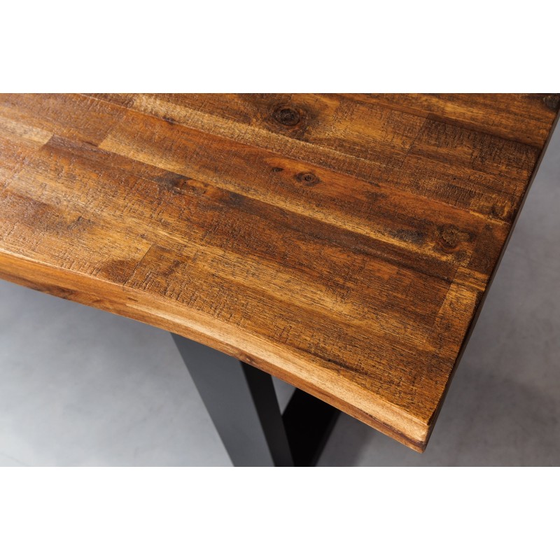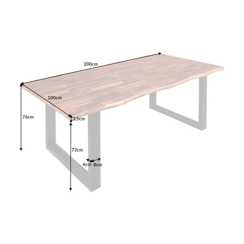 Avec son format généreux, cette table peut accueillir jusqu’à huit convives dans le plus grand confort. Son plateau épais de 35 mm repose sur des pieds en métal de 4 × 8 cm, garantissant une stabilité à toute épreuve et une capacité de charge maximale de 145 kg. La forme du plateau, irrégulière, conserve le charme naturel du bois et renforce le côté artisanal du meuble.