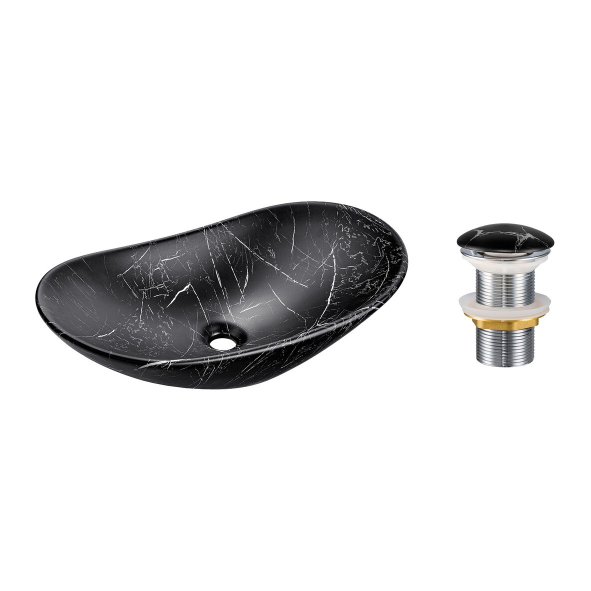 Voeg karakter en elegantie toe aan uw badkamer met deze ovale opbouw waskom 61,5x36 cm in zwart marmer effect, geleverd met een bijpassende click-clack (drukknop) wastafelplug voor een perfect harmonieuze afwerking. De subtiele marmeren decoratie op een zwarte achtergrond creëert een verfijnde en hedendaagse sfeer, ideaal voor een ruimte met een uitgesproken stijl.